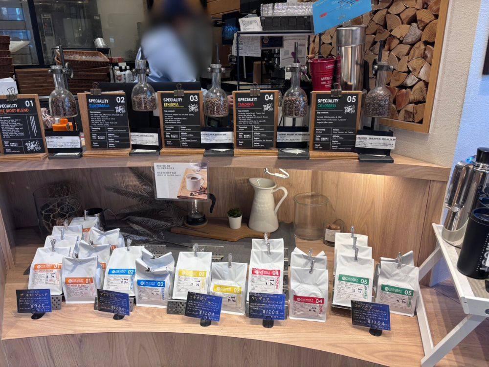 THE MOST BAKERY & COFFEE では、コーヒー豆を“自社焙煎”したものを使っているそうで、さまざまなコーヒー豆が販売されていました。