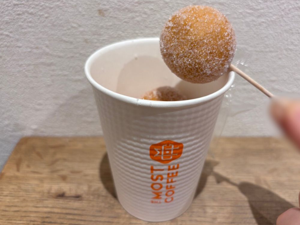 撮影するまで我慢ができず、少したべてしまった後なのですが、カップには8個くらいのドーナツが入っていました。