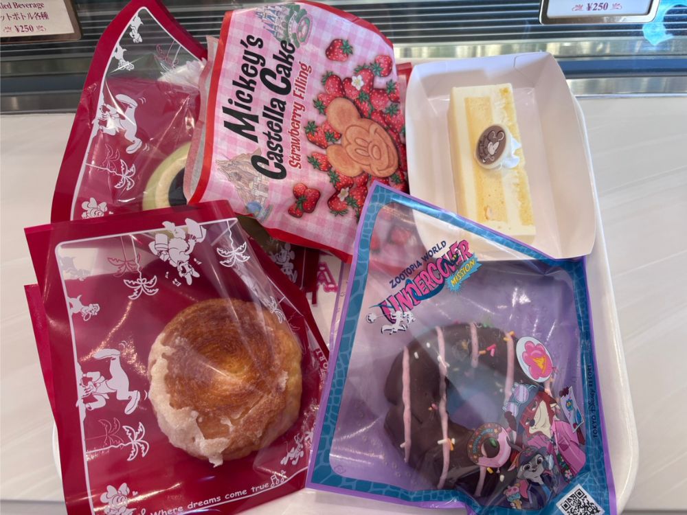 ミッキーシナモンロール、ミッキーカステラケーキ(ストロベリー)、おすすめデザートとしてドナルドのドーナッツが並んでいます。