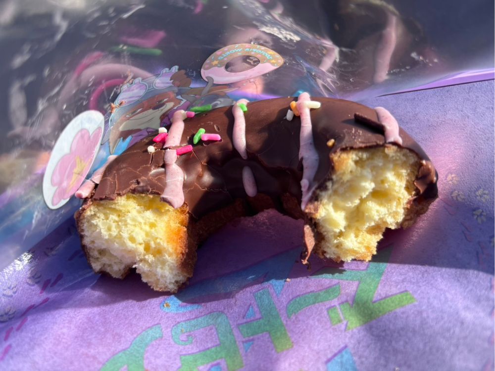 並んでいるときに、お昼にレストランの予約が取れたのでほとんどのパンを持ち帰ることにして、パーク内ではチョコドーナツとチーズケーキを夫と半分にして食べました。