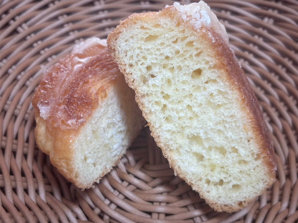 表面に砂糖がたっぷりとついており、見るからに甘そうという印象ですが、食べてみると見た目より甘すぎず飽きずに最後まで食べられます。