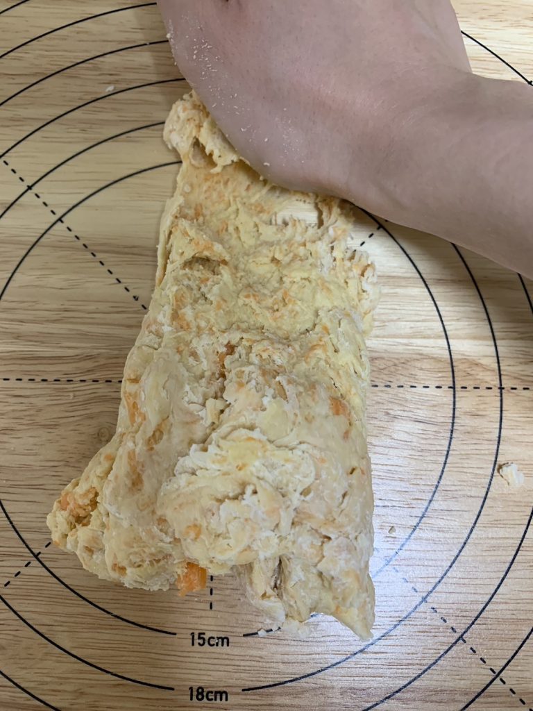 4.ヘラで混ぜ、ボウルの中でひとかたまりになったら台の上に出して手でこねる