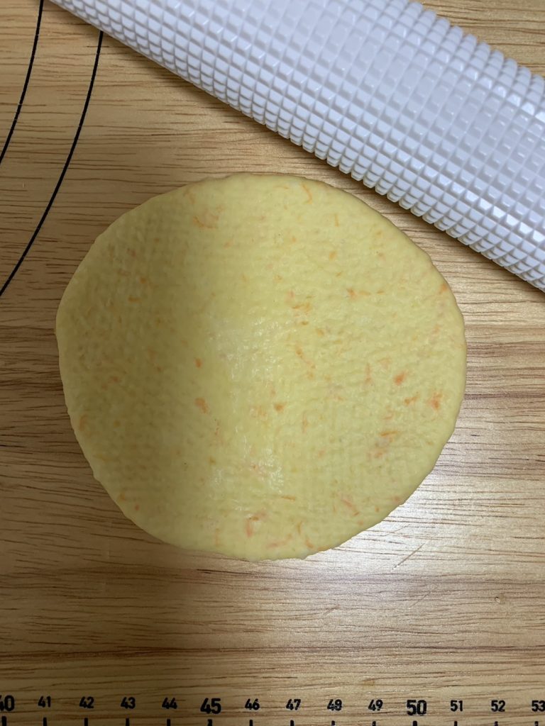 9.とじめを下にして、めん棒で8~10㎝程度に生地を伸ばす