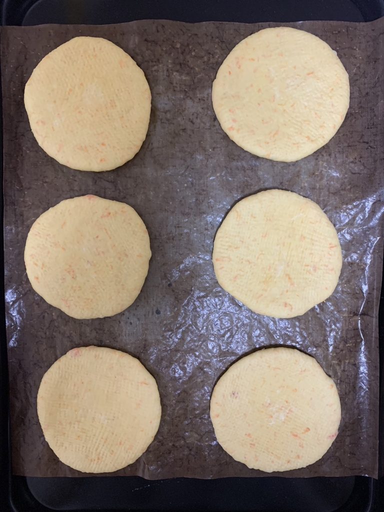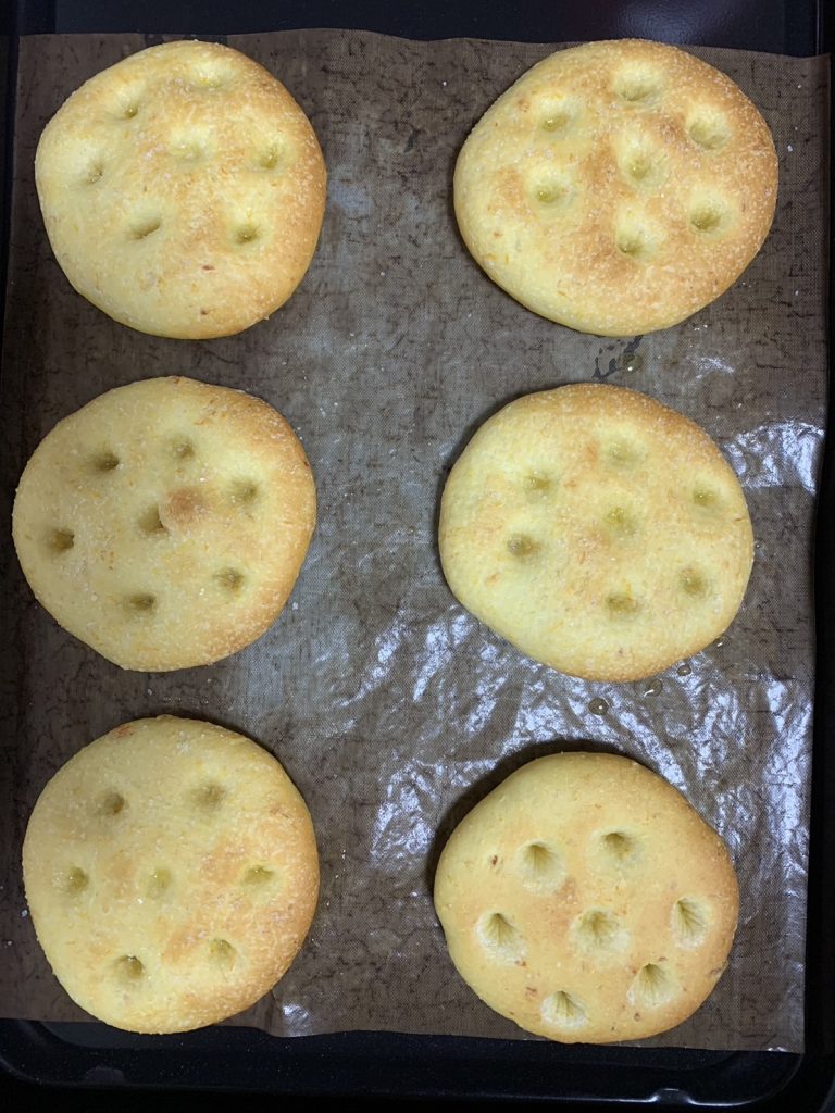 塩分が気になる方はトッピングの岩塩を、お子様にはトッピングのオリーブオイルと岩塩をお好みで減らしてみるのも良いです!また、もっとボリュームを出したい!という方は、焼成前に野菜やソーセージ、チーズなどを乗せてピザのようにして食べるのもおすすめの食べ方です♪もちろん焼いた後に何か乗せても美味しいです!(^^)!生地がオレンジ色になるのでパーティーごはんなどにも良いですね♪