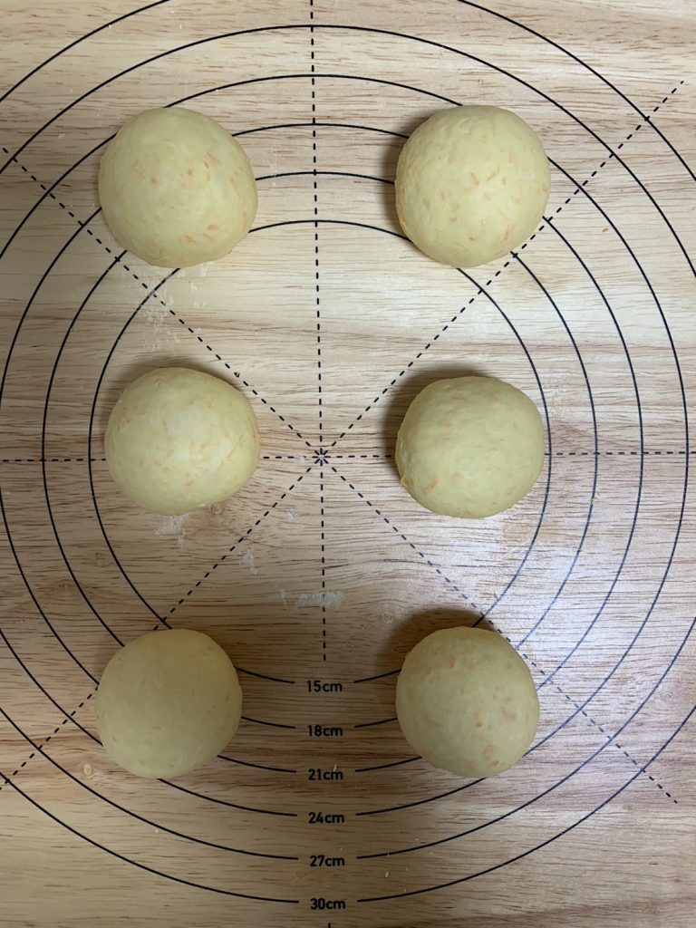 7.生地が2倍になったら発酵した生地を取り出し、50gずつ分割し軽く丸める