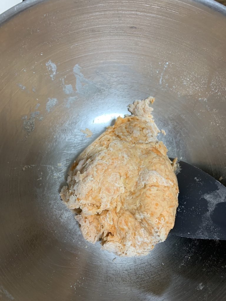 4.ヘラで混ぜ、ボウルの中でひとかたまりになったら台の上に出して手でこねる