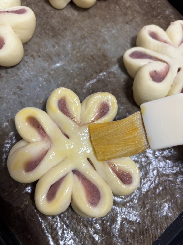 16.二次発酵が終わったら、生地の表面に溶き卵を塗る