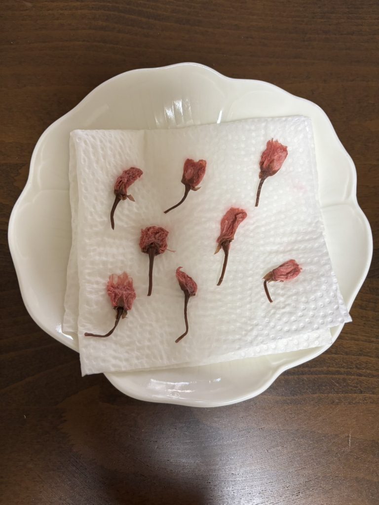 15.桜の花の塩抜きをして、花の根本部分はカットして、水分を軽く取っておく