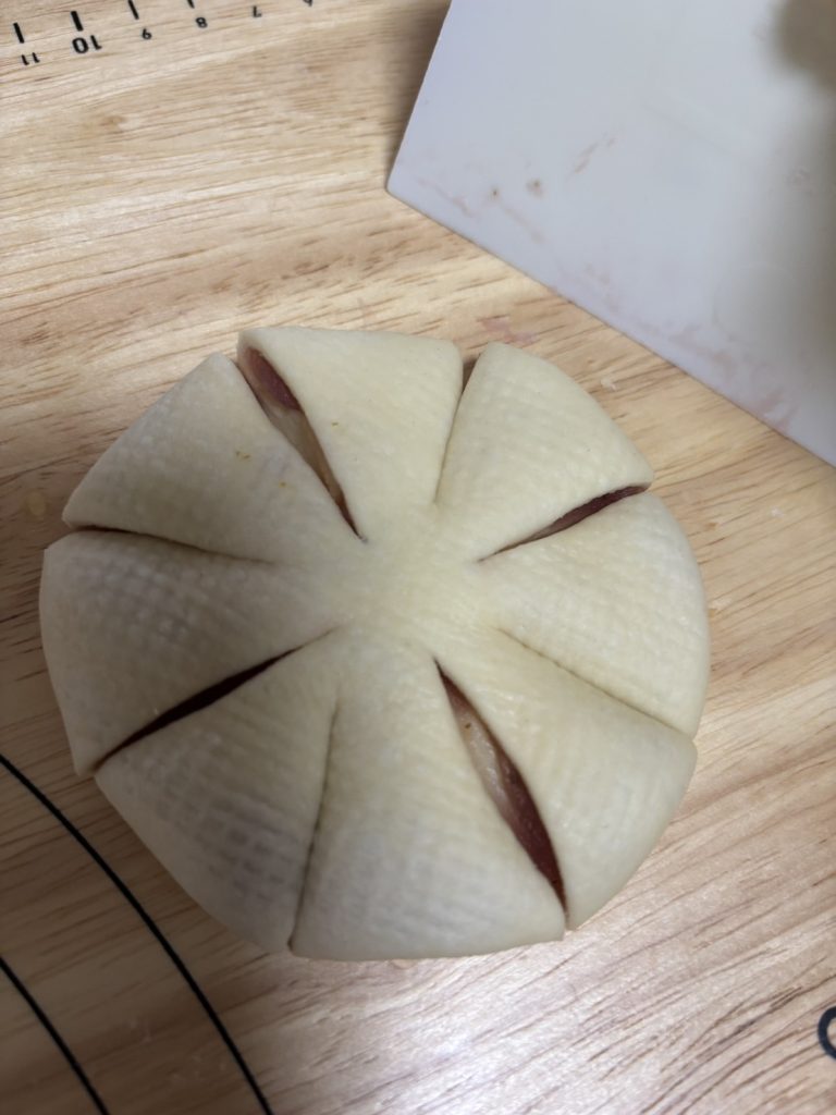 12.とじ目を下にしてめん棒で軽く伸ばし、スケッパーで8か所切り込みを入れる