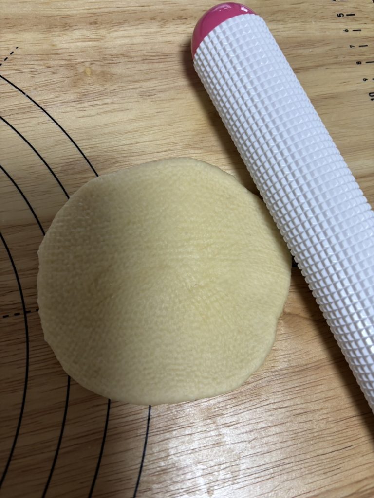 8.生地のとじ目を上にして、めん棒で7~8㎝程度に伸ばす